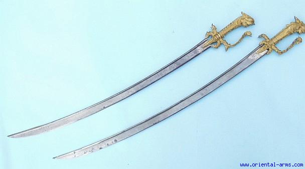A pair of almost identical, superb example of the Kastane swords, the national sword of Sri-Lanka. with 26 and 27 inches steel blades and gilded grips of great decorative values – A piece of art by itself. The monster styled quillons, the engraved D guard and grips, and above all the monster head pommel with all parts delicately chiseled and engraved with great care and fine details. Total length 33 and 34 inches. All in very good condition. An unusually decorative piece of high quality, probably mid 19 century. |