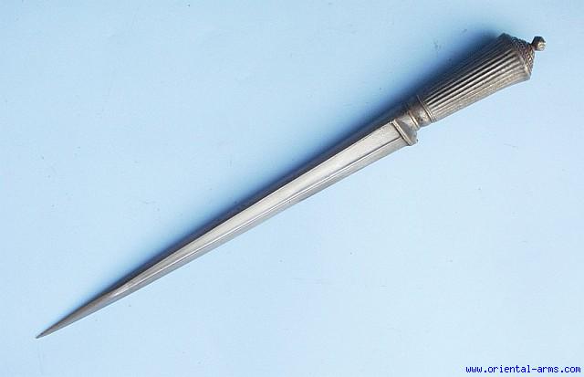 A really unusual piece. This is an Old Karud dagger, probably of Indian origin and an early example, 18 C. or earlier. Narrow but heavy blade with acute tip and reinforced edge, 14 inches long. Whole steel handle of ribbed cylindrical form with nicely decorated pommel. Total length 18 inches.. Very well balanced piece, meant for business. Very good condition, nice age patina all over. |