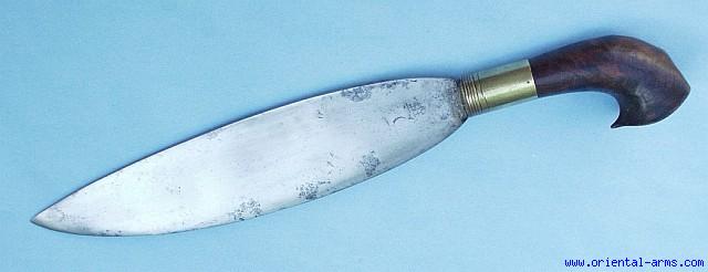 A good old Moro Barong with a Chinese maker mark. The Barongs heavy leaf shaped blades is known to have superior cutting abilities. This blade is 12 ½ inches long heavy and signed with Chinese characters (Many sword smiths in the Philippines were of Chinese origin). The hilt is carved from a beautiful grained wood in the classical form, bound to the blade tang with a brass collar. The tip of the pommel is flat and not as common with Barongs handles. There is no scabbard. Very good condition. Blade with few minor discoloration spots, few old cracks to the wood grip. Surprisingly low price of this beautiful sword. |