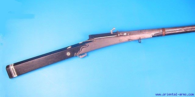 A very Fine piece from the famous Figiel Collection of Indian arms and armor. This piece is also shown and described in Figiel book: On Damascus steel ( Item G 12 P. 137 and on the back cover page) A Damascus barrel with the very rare Orange pattern, and side plates with diamond pattern steel. Black wood mounts inlaid with ivory inserts of ducks and flowers and pierced ivory insert at the butt. Very good condition. |