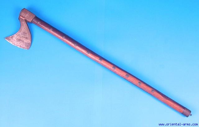 Up for sale is this 19 C. battle axe from India. 3 ½ X 5 inches re-curving blade lightly decorated with silver koftgari work. The haft is wood with steel tip. Total length25 ½ inches. Very good condition.