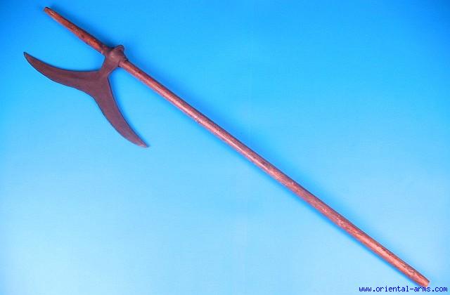 The BULLOVA is the traditional fighting axe of the Chota Nagpur aboriginal tribes of central India. It comes in a variety of blade shapes. This one is 14 x 5 inches , hand forged. It is mounted on a dark wood shaft 38 1/2 inches long, through its heavy socket. Good condition. Vary attractive price.. |