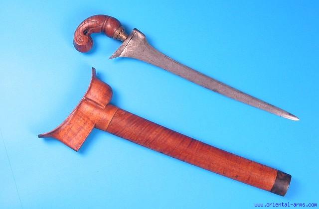 This nice Bugis Keris Dagger has an old blade 12 inches long. The mendak is engraved copper. The hilt and the scabbard are carved from a beautifully grained wood, in a classical Sulawezi style with a nice horn tip. Total Length 16 1/2 inches. Very good condition. The blade fits perfectly into the scabbard. |