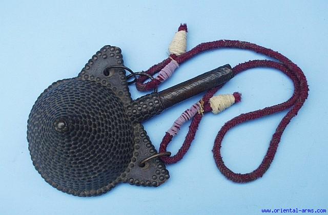A very nice Moroccan wooden powder flask in a cone shape 6 inches in diameter 5 ½ inches tall entirely covered with leather and decorated with brass tacks . Two wooden ears with the same decoration to hold the carrying rings. Cotton baldric belt. 6 inches long brass covered mouth piece. This is a very nice example highly decorated and of good quality. Very good condition. Tips of the ears lightly chopped. Baldric repaired. |