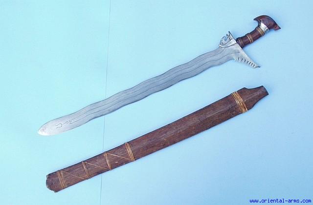Up for sale is this heavy Moro Kris sword. Wavy blade, deadly sharp, 23 inches long, forged from laminated steel. Wood handle bound with three bands of braided rattan, with a beautiful Cockatoo shaped pommel carved from grained wood with an engraved silver collar. One steel clamp (Baca Baca). Wood scabbard bound with rattan fibers. Total length (in scabbard) 29 inches. Very good condition. Minor NONACTIVE worms damage on the scabbard. |