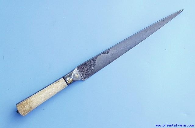 Seldom one sees such a beauty on the market: A very fine Persian Kard dagger, with a thickened tip for armor piercing. Superb wootz blade, 10 inches long, with very finely chiseled base on both sides and on the spine. Steel bolsters and grip strap, finely inlaid with gold . Walrus ivory grips, entirely cut from the inner marble like part of the tusk. Total length 15 inches. Fine condition. Some minor age shrink and small chips of the ivory grips. Minor pitted spot on the blade. No scabbard. A very fine piece. |