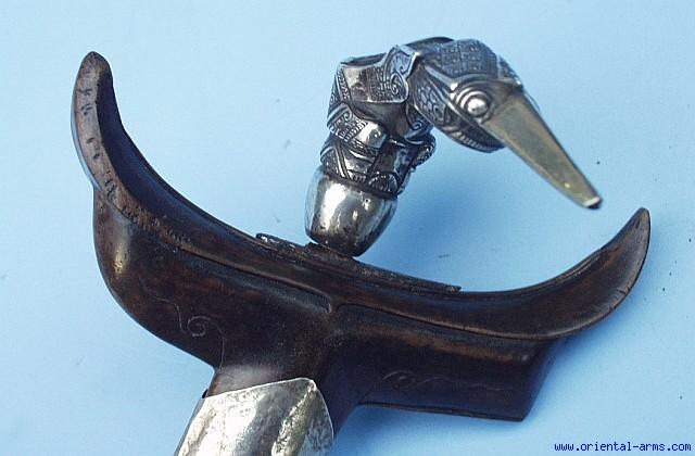 One of the rarest forms of kerises, the Coteng from the Malayan peninsula. Short, very old blade, 9 ½ inches long and slightly slightly curved. Silver hilt in the coteng typical shape with its long beak. Wood scabbard with silver bands and silver tip. Very good condition. Blade lightly pitted. The very tip of the hilt beak is lightly damaged. A very rare piece. |