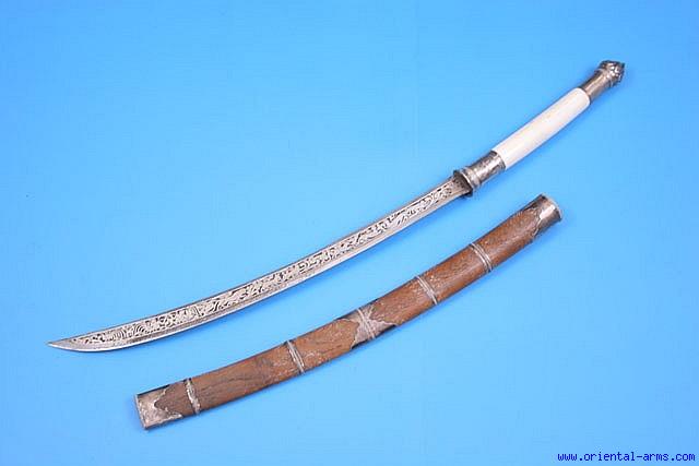 Up for sale is this very fine Dah sword, probably of Burmese origin, with a finely chiseled and silver inlaid blade in a typical Burmese style, depicting men, animals and hunting scenes. Silver mounted handle with a massive ivory grip and onion shaped silver pommel. Original wood scabbard with silver fittings. Very good condition, with minor shallow pitted area on the blade edge. |