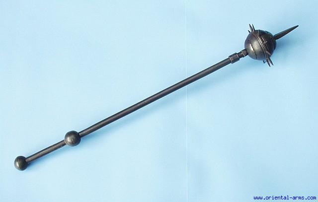 A fine and interesting battle mace from India, probably late 18 C., With a steel ball head and 11 side spikes, each of rectangular cross section. The head size net of the spikes is 3 inches. It is mounted on a steel haft with twp balls serving as handle ends and a top 3 inches spike. Total length30 inches. Very good condition with excellent age patina. One of the head spikes is slightly loose. |