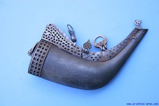 Up for sale is this rare and one of a kind steel powder flask, Persia, most probably late 18 C. made entirely from wootz (Damascus) Steel, with all fittings beautifully pierced all around. Almost 5 inches long. Next to excellent condition.