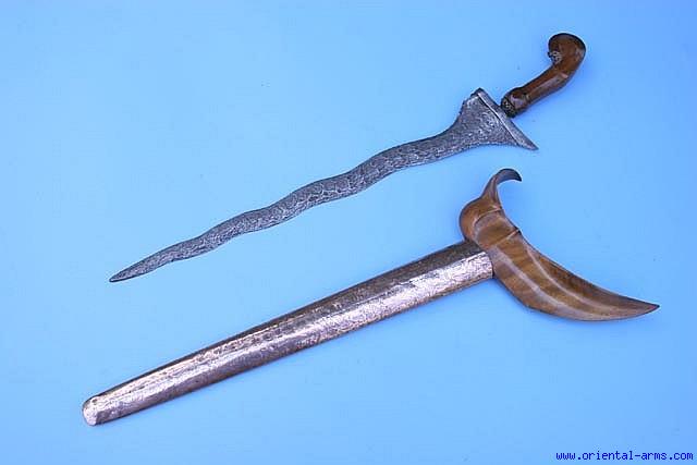 A fine piece with a very old blade with clear and unusual pamor structure, 15 inches long. Classical wood grip and brass mendakWood scabbard covered with engraved copper sleeve. Very good condition. Very reasonable price.
