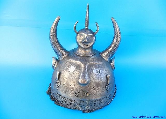 Up For sale is this rare early 19C pierced steel Qajar helmet. The helmet is in a shape of a mythological horned figure with a smaller one on top of it. It is pierced at the back and all around the base with Islamic calligraphy in the fashion of fine Qajar steel work. The mustache , large horns and eyebrows are beautifully engraved. The large horns are slightly different in style and may be a late 19C. addition. Very good condition. Most of the Mail is missing. few very light pitted spots. A piece of high quality. |