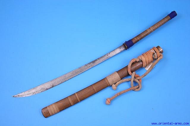 Up for sale is this Dah sword from Burma. Not a princely sword but a real weapon of the common warrior. A 20 inches heavy blade, deadly sharp. 11 inches long wood handle allowing a two handed gripping, bound with braided rattan rings and decorated with blue threads. The wood scabbard is also bound with braided rattan rings and decorated with white threads binding. This sword comes with its original baldric carrying rope. Total length 32 inches. Good condition. Some blackened spots on the blade with good age patina. The handle is somewhat loose and need to be fixed in place. The scabbard upper copper locket is damaged. Very good price for this real battle sword. |