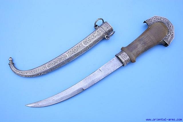 Up for sale is this very Fine Koumaya Dagger from Morocco, with a classical blade, 9 ½ inches long, double edged at its lower half and single edged at the top. The handle is carved from a massive piece of Rhino horn with a very clear fibrous structure. The pommel head is chased silver and it is stamped in several place with a big silver proofmark, including the year of 1318 ( 1900 in the Gregorian calendar). The scabbrd is made from heavy silver, engraved in a classical Moroccan design. Total length 16 ½ inches. Very good condition. The horn grip has few small bugs holes which were filled and painted. The side of the pommel head is slightly damaged. |