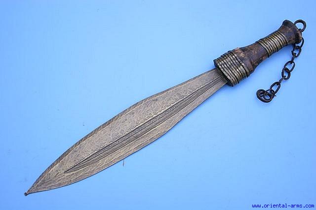 Up for sale is this African dagger with a brass made blade. It is probably from the Kuba tribe, central Zaire. Blade 10 inches well made from hammered brass with a good edge. The very shallow central rib is decorated with very fine geometrical design. The handle is wood covered with brass strip with a short steel chain attached to the pommel. Very good condition. Brass and copper blade on African weapons were highly regarded, sometimes more that steel blades, and were carried by the royalties and high ranking people of the tribes. This dagger is coming from a big private collection and an old label indicate that it was collected in July 1984. |