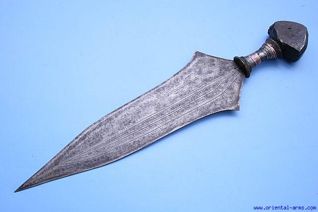 In the heart of the African rain forest, near Stanley Falls the Tetela people are using a very peculiar knife / short sword. It is characterized by a Diamond shaped, big and heavy steel pommel. The purpose of this heavy pommel (some time as heavy as four pounds) is not clear. Some people say it was supposed to be used as a drop knife from the height of a tree (A very complicated task in the dense vegetation of the rain forest), other say it is meant to increase the blow of the blade. It is most probably a sign of wealthy and power that was developed during years from a smaller pommel, and reached super non-practical sizes when firearms replaced blades in Africa. This one is a very nice exemplar, 14 inches long blade 4 ½ inches at its widest point. The blade faces are delicately incised with lines and geometrical design. Wood hilt bound with copper and iron strips. Total length 19 inches. Very good condition. Good age patina to the blade and the steel pommel. Repair signs to the handle and copper bindings. No scabbard. This item is coming from a big private collection, and an old label on the blade indicate that it was added to this collection in March 1982. Very Rare sword. |
