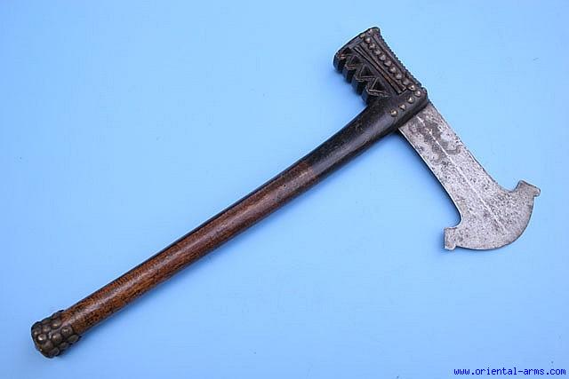 Up for sale is this rare and hard to find war axe of the Lwena people from southern Zaire / Angola. Their neighboring Chokwa people uses a similar war axe.. Fine thin blade reinforced with a shallow central rib and decorated with simple geometrical design, 6 inches long with a 5 inches edge. Wood haft with the typical finely carved rear protrusion decorated with brass tacks. Total length of haft 17 inches. Very good plus condition. Fine age patina on the blade and on the wood handle. A scarce item. |