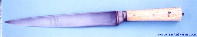 This is a very fine Indo-Persian Kard of unusual big dimensions. The blade is 12 inches long and very massive (compared to the average 9-10 inches blades). It is forged from good Indian pattern welded (Damascus) steel. Steel bolsters and hilt strap and ivory grips. Total length 17 inches. Excellent condition. Minor age cracks and a very small chip near one of the grips rivets. A really rare and beautiful piece expensive but you do not see many around. |