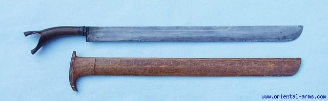 A very interesting Klewang, one of the many variations of the Indonesian machete like knife. This one is probably Acheen from Sumatra, the second half of the 19th C. The blade is straight and single edge, 20 inches long with a 13 inches long fuller just below the spine. The steel bolster is forged in a polygonal shape. The hilt is carved of horn in a typical forked pommel. The scabbard is made of light colored wood, very finely engraved. Total length is 27 ½ inches. There are few forging flaws in the blade and few nicks on the edge. The hilt has an age cracks but otherwise in very solid condition. It is quite difficult to find these Klewang complete with its scabbard, and every collector of Indonesian weapons / art should love to add it to his collection. Very reasonably priecd. |
