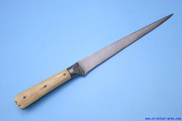 Up for sale is this Kard Knife, probably late 18 or early 19 C., with a fine wootz blade of very clear high contrast pattern. Length of blade 8 ½ inches. The grips are bone, old with good age patina, but probably a later replacement and the bolsters are also wootz steel ( The right bolster for sure, the left one may be a replacement). Good condition. Some minor grinding signs on the blade and also on the grip strap. No scabbard. Total length 14 inches. Very low price. |