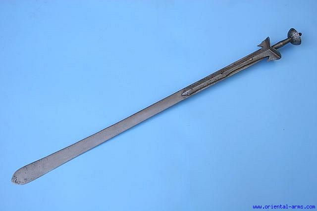 Up for sale is this old and very rare sword, late 17 to early 18 C. The Khanda shaped blade with a spatula tip is 33 inches long, almost two inches wide and forged from good wootz steel. The handle is whole steel, old Hindu style, with long reinforcement extension bars to hold the blade. Total length 38 inches. Very good condition to age. Shallow pitting and minor blackened spots on the blade and handle. One rivet is missing. No scabbard. A very scarce item. For a very similar sword, see P. S. Rawson The Indian Sword, Page 55, Fig. 14. |