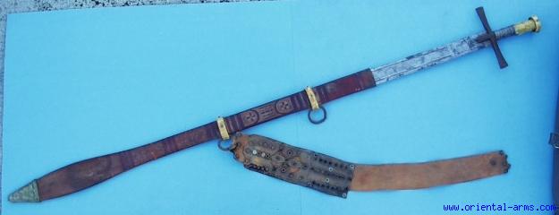 A very good, old and complete Kaskara sword from the south Sudan Area. The blade is of better quality than the average seen on such swords and it is signed on both sides with the royal marks: The “Lion of Judea”. It is 36 inches long and more than 1 ˝ inches wide. The handle is wood covered with a crocodile skin at the upper half and silver collar at the lower half. The scabbard is complete with its silver (?) tip. Good condition. The blade has few darkened spots but not deep pitting. The scabbard belt fixtures is damaged. Unfortunately the blade does not go all the way into the scabbard but this can be probably be fixed. Very good sword. Worth the investment. |