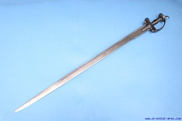 This Fine sword comes from India. It reminds the Firangi swords with the European long blade but here we have a fine wootz blade with reinforcement bars like the Khanda swords style. The blade 35 inches long, finely forged from Indian wootz ( crystalline). The basket hilt is steel, beautifully pierced all around. Total length 41 inches. Very good condition. Small damage to one of the reinforcement bars on the blade. The rivets holding the bars are replaced. Some repairs at the basket hilt bottom. A fine sword. |