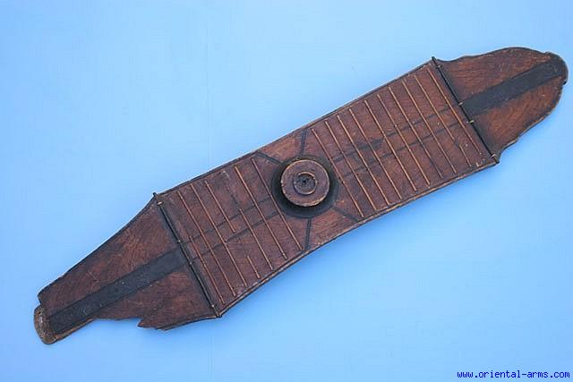 Up for sale is this small wood shield from Mindanao, probably Bagobo. Smaller sizes than usual, may be a shield made for a boy. 33 inches long, 8 inches wide, painted wood, slightly curved, with holding handle carved from the wood. Rattan strips are covering both the outer and the inner face of the shield. Good condition with one lower corned broken and lower tip missing. Few rattan strips missing or lightly damaged. Rare authentic item. |