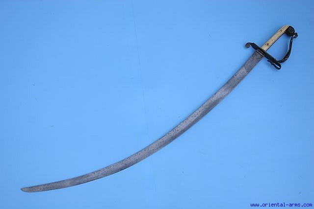 Up for sale is this very unusual Shamshir sword, with a Persian made Wootz blade of classical Shamshir form, 31 inches long. The Afghan attribution comes from the handle shape, the cross guard and the pierced knuckle guard in the style of the semi military Afghan edged weapons issued to the Afghan military forces in the last quarter of the 19 C. The grips are bone, with horn pommel tips. Good condition. Wootz pattern is visible in many places but especially along the heat hardened edge. Shallow pitting on the blade with minor deeper pitted spots. One of the pommel horn tips is lightly distorted. No scabbard. |
