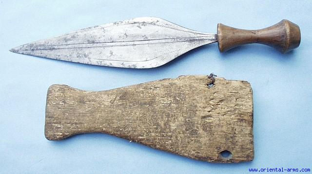 A good real fighting Knife / Dagger of the LEKA tribe residing in Eastern Zaire. The blade is spear head shaped 12 inches long, 3 inches wide, well forged, very sharp with a central strengthening rib and reinforced edges. The handle is hardwood, polished and with very good age patina. The scabbard is very simple wood box, of a lesser quality than the blade and may be a later addition. Very good condition altogether, very few pitted spot and few only darkened areas. This is a real weapon meant for business and of highest quality compared to the many ceremonial / touristic items coming from Africa these days. |