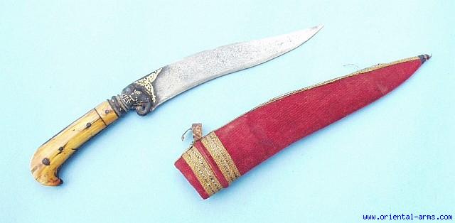 This little unusual Indian kard dagger is very interesting in the elephant shape bolster extending from the ivory gripped handle to hold the blade heel. The blade is re-curving, made of good wootz and is 5 ½ inches long. The scabbard is covered with red velvet (later to the knife). Total length 10 inches. Good condition. One of the grips is cracked but holds well. Few pitted spots on the tang. The gold koftgari decoration on the tang is lost but mostly remained on the bolster. |