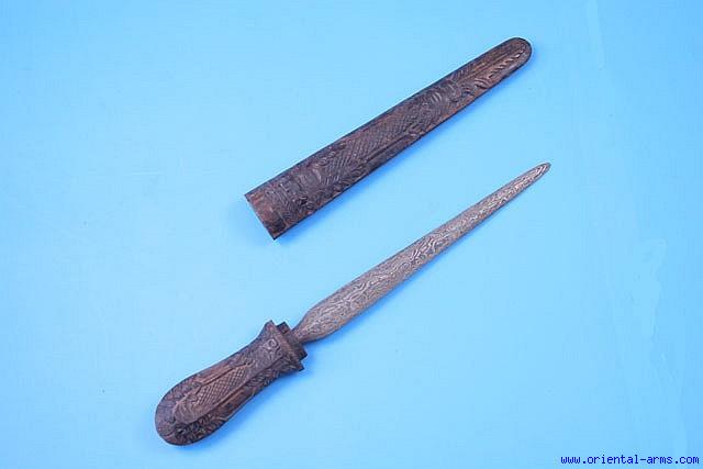 Up for sale is this short dagger, probably a conversion from a spear head, but well made and a useful weapon in the experienced hand. The fine pamor blade is 9 inches long, mounted in a beautifully carved wooden hardwood handle and sheath. Total length14 ½ inches. Very good condition. |