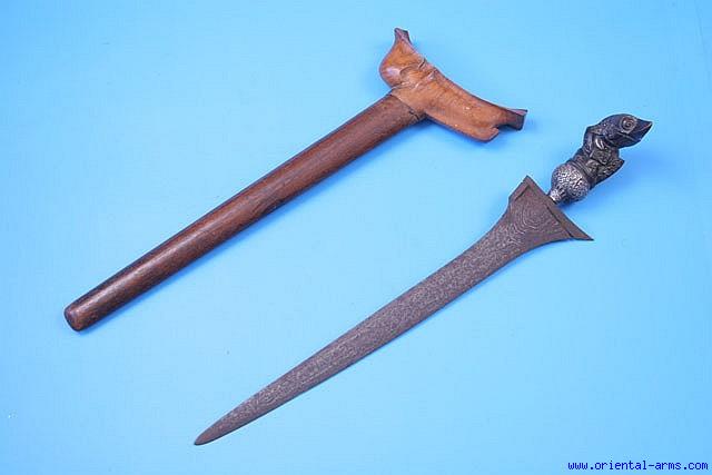 Up for sale is this high quality Keris dagger from Sumatra, 19 C. Straight and very slightly curved blade 13 inches long with nice and clear pamor structure. Wood grip beautifully carved in the Jawa Deman style with chased silver Mendak.. Beautifully grained wood scabbard with perfect fitting of the blade. Total length 18 inches. Very good condition. A crack in the base of the handle but it holds solid. |