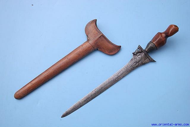 Up for sale is this very fine small keris dagger, probably from Sumatra, early to mid 19 C. The straight blade is 8 ½ inches long, forged from good laminated steel, with a beautiful lion figure chiseled at its base, just below the Ganja. The wood hilt is carved from beautiful grained wood and mounted with silver mendak. Fine complete wood scabbard with perfect fit to the blade. Total length 12 inches. Very good condition. Minor repair on the scabbard and hairline cracks on the scabbard top and hilt. A fine little Keris. . |