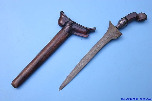 Up for sale is this very fine small keris dagger, probably from Sumatra, early to mid 19 C. The straight blade is 8 inches long, forged from fine pamor steel. The wood hilt is carved from beautiful grained wood and mounted with silver mendak. Fine complete wood scabbard with perfect fit to the blade. Total length 11 inches. Excellent condition with a small age crack on the hilt. The silver mendak is new. A fine little Keris. |