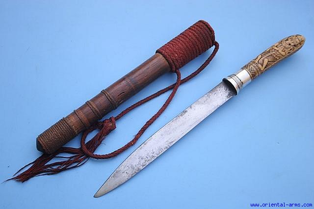 Although small, this one is a very fine example of a Dah dagger, probably from Laos. The blade is 8 inches long, slightly down-curving. Good ivory handle finely carved with human figures. Silver collar on the grip. Wood scabbard bound with braided rattan rings (few missing). Original red carrying cord. Total length 14 ½ inches. Next to excellent condition. Old and original fine piece. |
