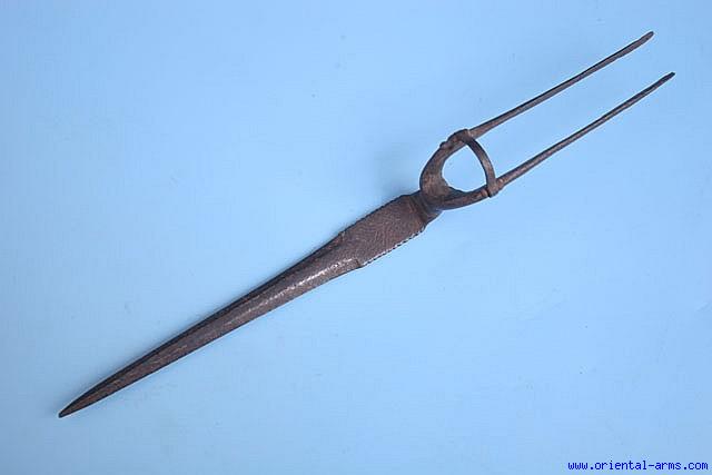 This one is a very rare item, known as Sangin, and it is actually a Bayonet, used in India in the 19 C. It was mounted on the Musket barrel. Blade length 7 inches. Total length 11 ½ inche. Very good condition.