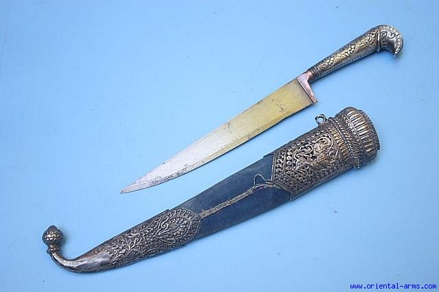 This is a beautiful Krd knife / dagger from India. The blade is 7 inches long, forged from Indian Wootz (Crystalline Damascus) steel. The handle as well as the scabbard fittings are a fine workmanship in silver: chased engraved and pierced. Total length (in scabbard) 14 inches. Very good condition. A fine piece. |