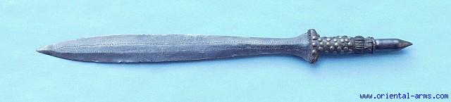 A very good and old Yaka sword. The Yaka people reside in the southern borders of Zaire, and they developed a sword of very typical shape. The blade (very well forged compared to most African blades on the market) is 17 inches long, of an elongated leaf shape, decorated dots punched into the blade steel. The grip is covered with animal hide decorated with brass tacks, and the pommel looks like a crown made from twisted brass wires with a long tubular pommel spike. No scabbard. Good plus condition, excellent blade patina but with few battle scars on the edges. |