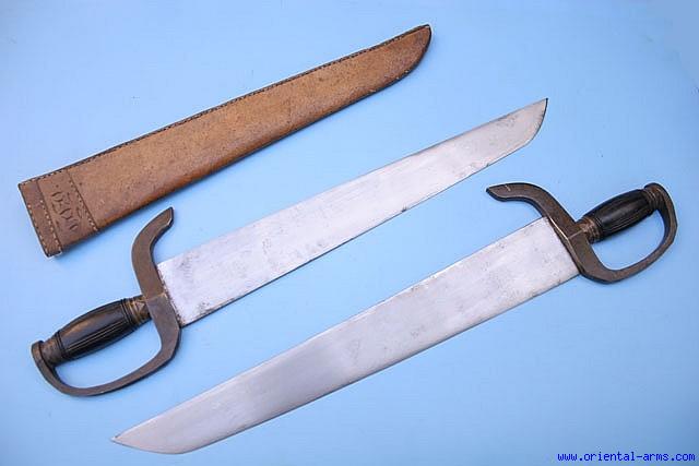 This is a good complete set of two Chinese short swords in a common scabbard. These swords are sometimes related to the Boxer wars in the turn of the 20 C. but they are not necessarily so, although the dating to the early 1900’s is correct. Heavy, wide blades, 16 ½ inches long, 2 ½ inches wide. Brass hand guards with wood grips. The two blades fits into a heavy leather scabbard. Total length (in scabbard) 22 inches. Next to excellent condition. A good interesting find. |