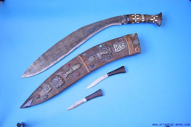 This Khukuri sword is early 20th Century vintage and of exceptional dimensions: Very long heavy and wide blade, more than 21 inches long. Both faces of the blade are inlaid with brass inscription and geometrical decoration design. The hilt is wood inlaid with pieces of bone. The scabbard is from the style known as box scabbard. It is made of wood beautifully carved in local design and mounted with brass decorative animals, corals and turquoise stones (several loose). The two accompanying Karda and Chakma are located in a back side compartment.. Total length 29 inches. Very good condition. Minor wood chips on the handle. An unusual Khukuri at a very attractive price. |