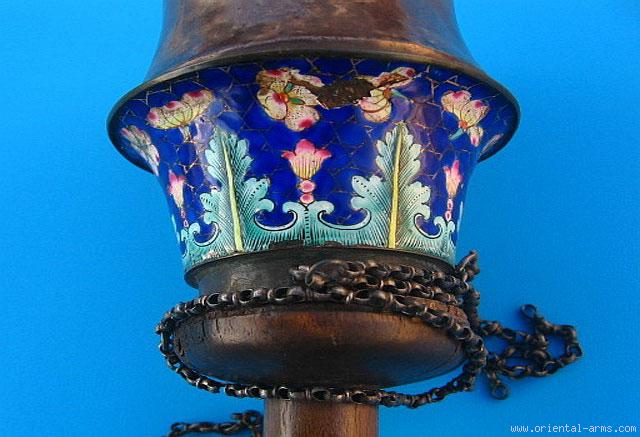 Although not a weapon as we usually sell, this is an interesting piece of art: Persian Hookah ( Nargileh, Shisha) cup from the Qajar period, second half of the 19. C. 8 inches tall, 3 ½ inches in diameter, this cup is made of multicolor enameled copper with silver top, on a wooden leg. The enamel work is of good quality; white and red flowers on dark blue background and thick green foliage. A piece of art. Very good condition. Minor loss to the enamel work and small chips to the wood. |