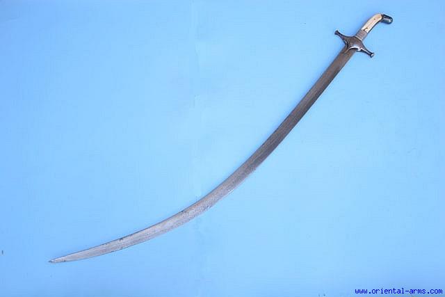 A Shamshir, the Eastern saber that for centuries enchanted the world and was copied in practically all armies of the western world. A light, curved, wedge shape blade of minimal and simple design and yet a lethal slashing weapon in the experienced hand. Here we offer for sale a classical example. A 33 inches blade forged from very fine watered steel (Wootz, Damascus) with high contrast, clearly evident on the entire blade length, steel cross guard, ivory grips with twisted siver wire binding and steel pommel. Total length 37 inches. Very good condition. The pommel cap and silver wire binding is a later addition. One of the grips is cracked but hold solid and a small crack in the steel cross guard. |