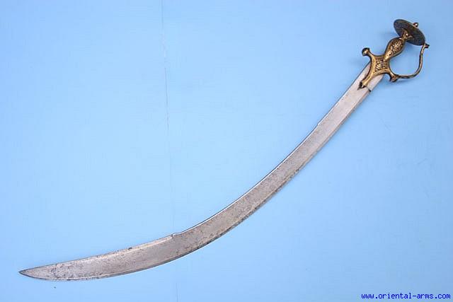 Up for sale is this fine and heavy sword, with up curving wide, deadly sharp blade 29 inches long, 2 inches wide, with a 11 inches long raised yelmenn ( back edge). The blade is forged from good pattern welded Damascus steel and clearly marked with the maker sign. The handle is steel, nicely chiseled and covered with very thin gold foil. Total length 34 inches. Very good condition. Minor blackened areas on the blade. few pitted areas on the handle with about 10 % of the gold cover lost. This sword comes with what remains from its original fabric covered wood scabbard, but badly damaged and worn (not shown). |