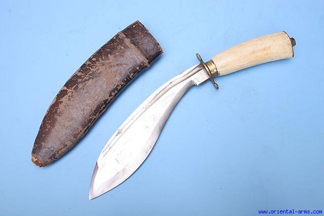 Up for sale is this very unusual Khukuri style knife. Short heavy blade, 7 1/2 inches long with 1 1/2 inches back edge. The handle is white heavy material, some form of stone. Brass S shaped cross guard and brass pommel cover. The scabbard is wood covered with leather. Total length 12 inches. Very good condition, only the tip of the scabbard is lightly damaged. |
