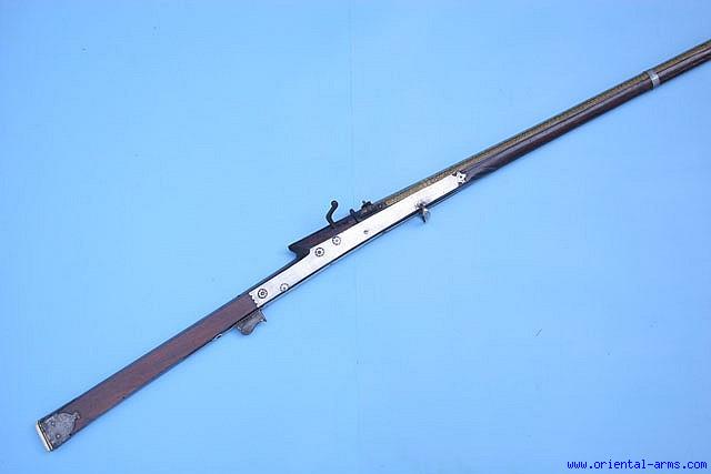 This is an extremely fine piece: An Indian matchlock rifle, probably 18 C., with a 49 inches barrel, lavishly decorated with gold work. The narrow and elegant wooden stock is mounted with decorative silver plates on the lock sides. The butt end is mounted with steel fittings and ivory tip. Total length 69 inches. Next to mint condition. The lock is in full working order. |