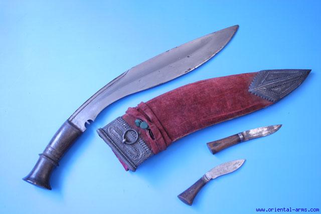 Khotimora, the Khukuri of the rich man. Here is a fine example, late 19 C. heavy fine blade 15 inches long, 2 1/2 inches wide. Wood grip with light engraving. Wood scabbard covered with red cloth and with heavy pierced silver fittings. Two accompanied knives (One a later addition). Total length 20 inches. Very good condition. Very minor edge nicks. Scabbard fabric lightly worn. Minor wood chips on the handle. Accessories compartment restored. |