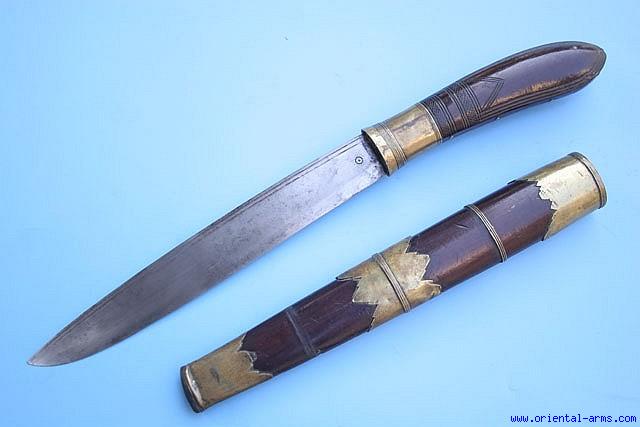 Up for sale is this heavy Dah dagger, probably of Thai origin, late 19 to early 20 C. heavy blade 10 ½ inches long, hollow ground with two narrow fullers along the spine. Engraved hardwood handle and scabbard with heavy brass mounts. Total length 18 ½ inches. Very good condition, with small damage to the scabbard tip. |