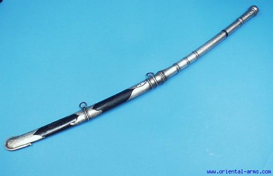 Up for sale is this very elegant old Dah sword from Laos (?). The blade is light and narrow, 19 inches long, well made. The long, 16 1/2 inches two handed handle is entirely covered with silver work. The black lacquered (?) silver mounted scabbard has a strong European influence (chape). Total length 36 inches. Very Good condition. There is a small damage to the lacquer.