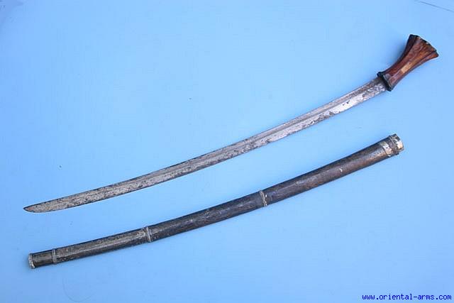 A very rare form of a Batak swords from Sumatra, probably of the Toba Batak people. The slightly up-curving slim blade is 22 inches long with a shallow fuller.(may be a secondary use of a European military blade). The fluted handle is cut from a massive piece of elephant ivory. Wood scabbard entirely covered with thin silver sheet. Total length26 inches. Very good condition. The blade has few blackened areas and shallow pitted spots. Very Good age patina on the handle and on the scabbard silver cover. A rare piece. |